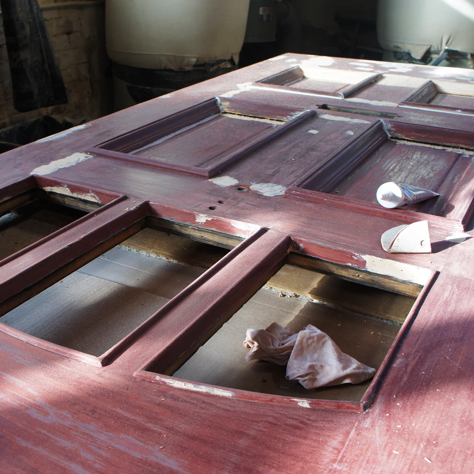 We’ve learned over the years, the best way to restore a door is to bring it into our workshop. Door restoration is a multi-step process so restoring your door on site can be costly and inconvenient for you. A temporary wooden insert can replace your exterior door until your beautiful door can be re-installed and the envy of the street.